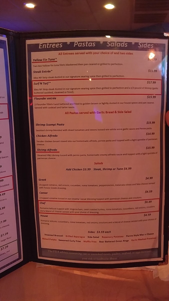 Menu highlights include shareable appetizers like fried dill pickles and tuna bites, rich pasta dishes such as shrimp scampi or chicken alfredo, and a variety of satisfying burgers with options like bacon and cheese. Sides like mac and cheese with added bacon add an extra layer of comfort to the meal experience.